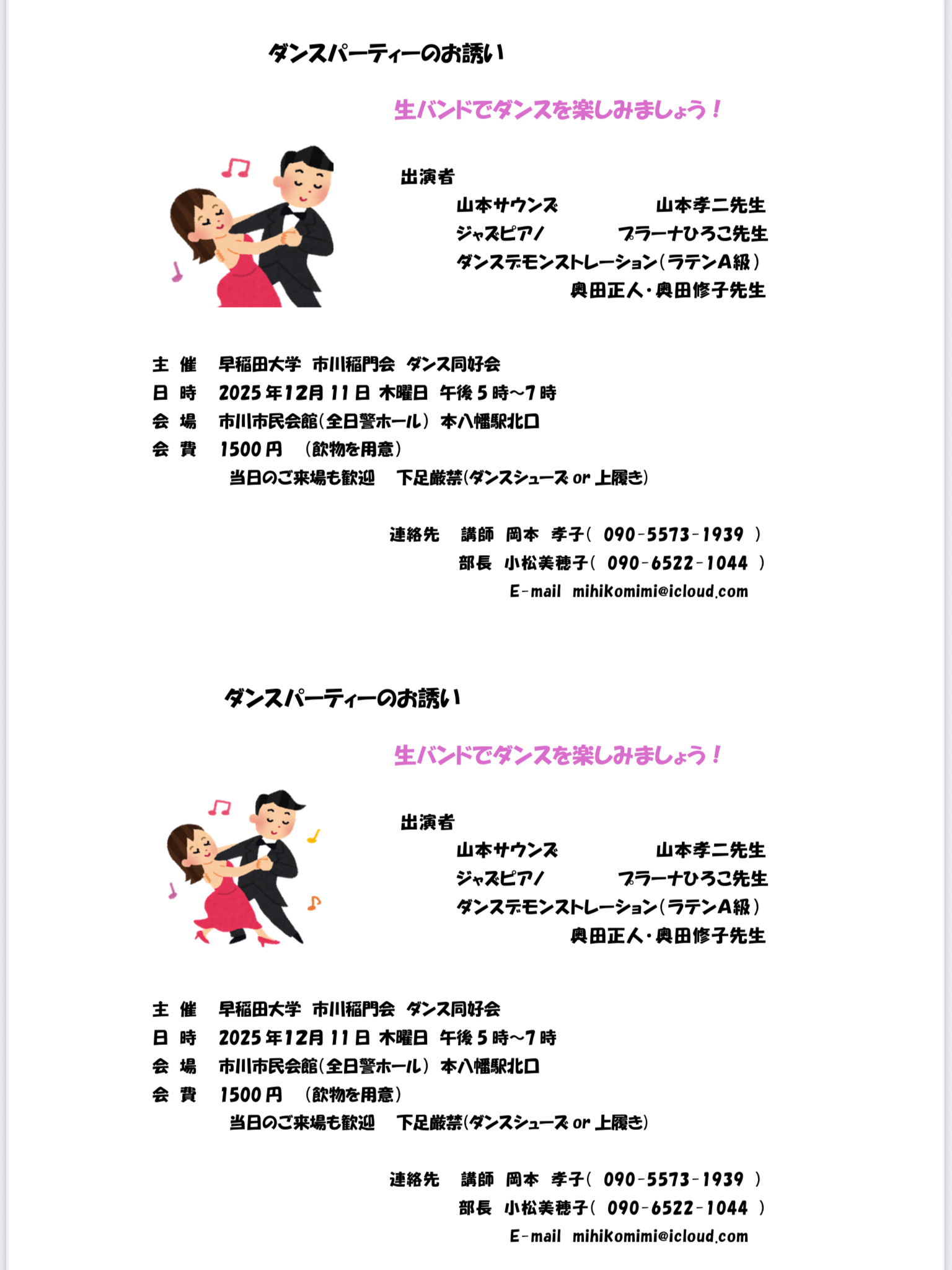 市川稲門会(早稲田大学OB会)の河嶌会長より市川浦安立教会の 皆さまへ市川稲門会のダンス同好会によるダンスパーティーの お誘いを受けました。 日程:2025年12月11日木曜日午後5時から7時 場所:市川市民会館 全日警ホール ご興味のある方は、ご参加ください。 お申し込みについては、市川浦安立教会事務局 中村までご連絡を ください。 よろしくお願いいたします。